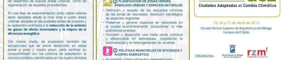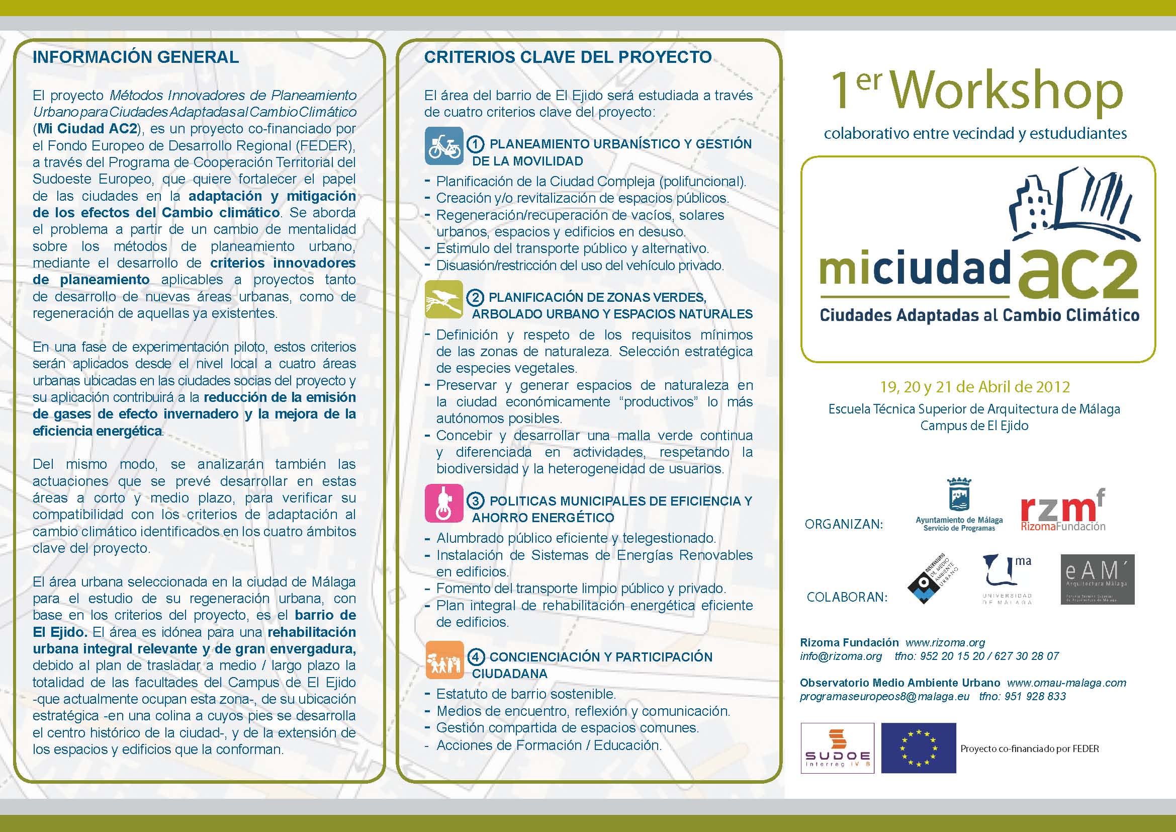 Los días 19 al 21 de abril acogieron con éxito el “1er Workshop Mi Ciudad AC2”, en el barrio El Ejido de Málaga (EAM-UMA), contando con más de 100 participantes. Esta actividad, organizada por Rizoma Fundación y el Observatorio de Medio Ambiente Urbano de Málaga (OMAU) se enmarca dentro del Proyecto europeo Métodos Innovadores de Planeamiento Urbano para Ciudades Adaptadas al Cambio Climático (Mi Ciudad AC2), financiado por el Programa de Cooperación Interreg IVB SUDOE. La finalidad de esta acción, que ha contado con la acogida de la Escuela de Arquitectura de la Universidad de Málaga en su semana cultural, es crear un marco de trabajo entre estudiantes y profesores de las Universidades de Málaga y Granada, vecinos y agentes sociales del entorno de El Ejido, técnicos del ayuntamiento de Málaga y colaboradores profesionales de Rizomaf. El workshop se orientó en torno a los cuatro cuatro ámbitos de trabajo del proyecto: (1) planeamiento urbanístico y gestión de la movilidad, (2) planificación de zonas verdes, arbolado urbano y espacios naturales, (3) políticas municipales de eficiencia y ahorro energético, y (4) concienciación y participación ciudadana. Se contó además con la participación de Paisaje Transversal (Madrid), CWLab (Granada), FabLab (Sevilla), Zuloark (Madrid), AIS redes (Madrid) y MAIAconsultores (Málaga).