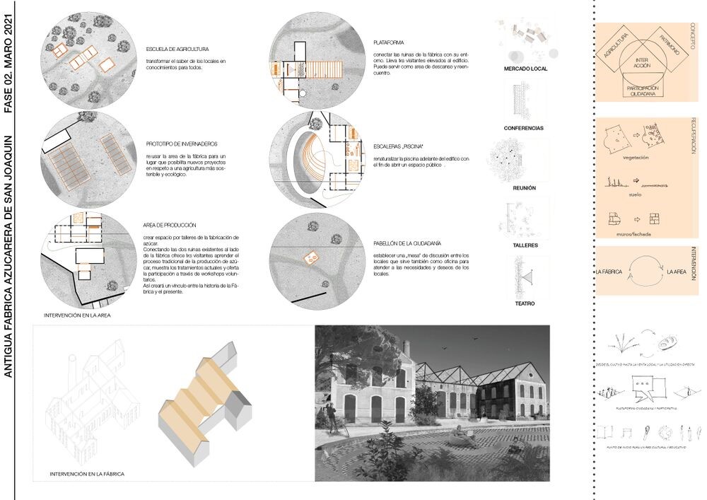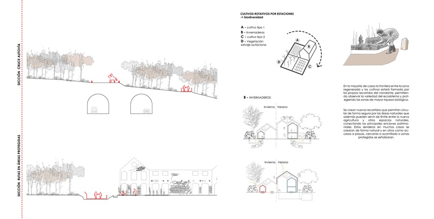 El paso del tiempo está presente en el proyecto (imagen 2). Las cosas no se dictan a la manera moderna para resolverlas de una vez por todas y según un único punto de vista. Quedan matizadas para acoger las circunstancias que sobrevengan. Esta cuestión sobrevuela especialmente en el planteamiento patrimonial, en el agrícola y en el social-comunitario. De ahí que las propuestas, más que determinar soluciones, sugieren maneras de hacer.